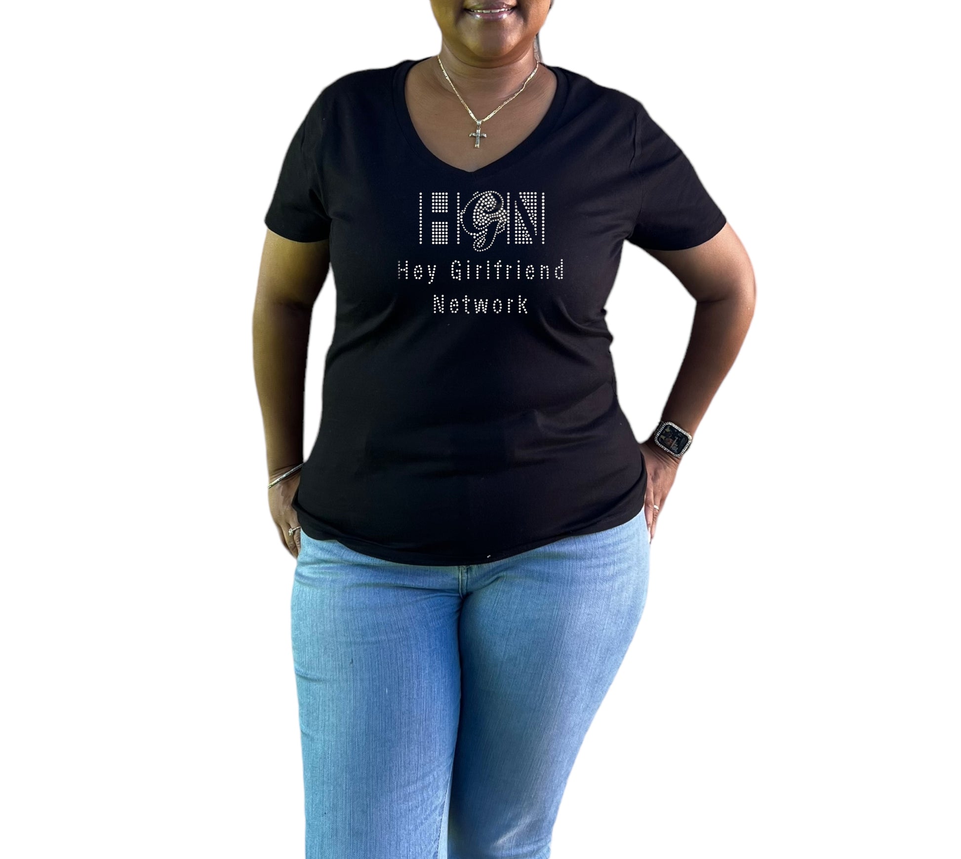 The Hey Girlfriend Network rhinestone women's fitted t-shirt is a dazzling fusion of style and sophistication. This stunning shirt is designed to make you shine and stand out, whether you're attending a special event, enjoying a night out on the town, or simply adding a touch of glamour to your everyday look representing Hey Girlfriend Network with style and grace.